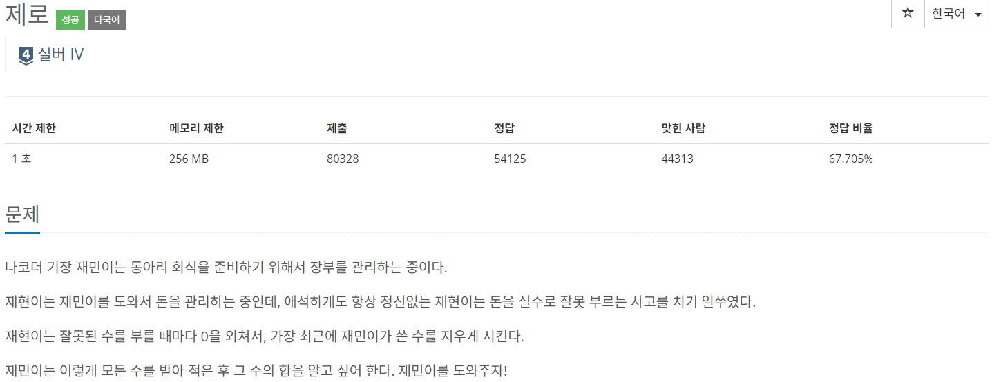 첫 번째 줄에 정수 K가 주어진다. (1 ≤ K ≤ 100,000) 이후 K개의 줄에 정수가 1개씩 주어진다. 정수는 0에서 1,000,000 사이의 값을 가지며, 정수가 "0" 일 경우에는 가장 최근에 쓴 수를 지우고, 아닐 경