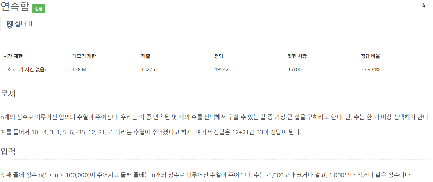 첫째 줄에 정수 n(1 ≤ n ≤ 100,000)이 주어지고 둘째 줄에는 n개의 정수로 이루어진 수열이 주어진다. 수는 -1,000보다 크거나 같고, 1,000보다 작거나 같은 정수이다.