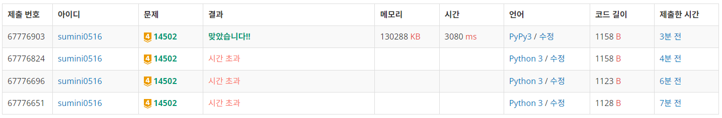 시간 초과 이슈로 여러번 바꿔서 풀어봤지만.. 결국 Pypy로 제출하니 성공했던 문제.. 다른 사람들의 정답 코드를 봐도 PyPy가 대부분인 것을 보아하니 어쩔수없는 부분인가 보다.. C++을 다시 해야하나.. ㅠ