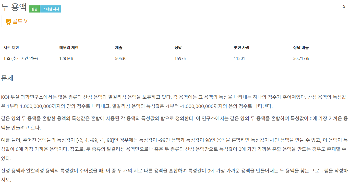 첫째 줄에는 전체 용액의 수 N이 입력된다. N은 2 이상 100,000 이하이다. 둘째 줄에는 용액의 특성값을 나타내는 N개의 정수가 빈칸을 사이에 두고 주어진다. 이 수들은 모두 -1,000,000,000 이상 1,000,00