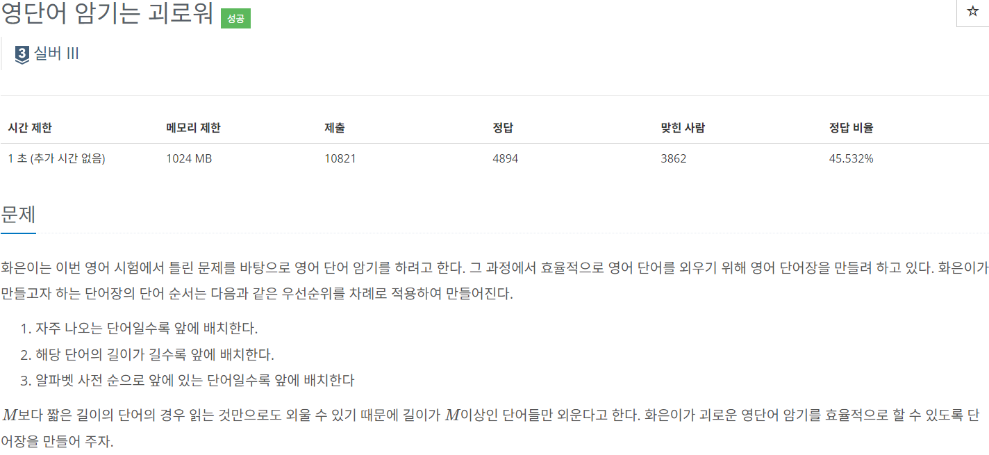 첫째 줄에는 영어 지문에 나오는 단어의 개수 $N$과 외울 단어의 길이 기준이 되는 $M$이 공백으로 구분되어 주어진다. ($1 \leq N \leq 100\,000$, $1 \leq M \leq 10$) 둘째 줄부터 $N+1$번째 줄까지 외울 단